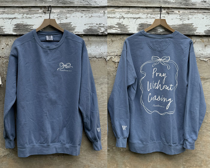front chest with a bow, Pray without ceasing across the back with a bow, and our signature W logo on